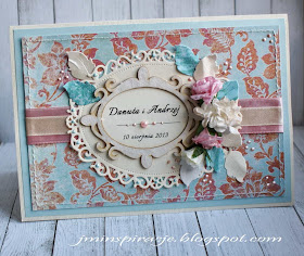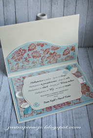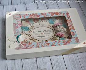Miałam za zadanie wykonać trzy zestawy na trzy śluby. W skład zestawu wchodziła kartka A5 w pudelku, a do tego etykietka na butelkę z winem.